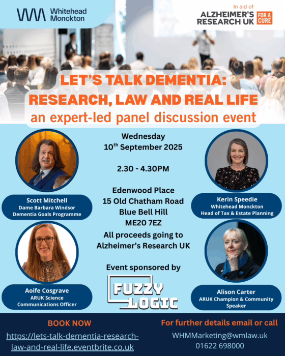 To mark World Alzheimer’s Month, Kent law firm Whitehead Monckton is bringing together a stellar line of experts for a public panel discussion event with Alzheimer’s Research UK on Wednesday 10th September in Maidstone.